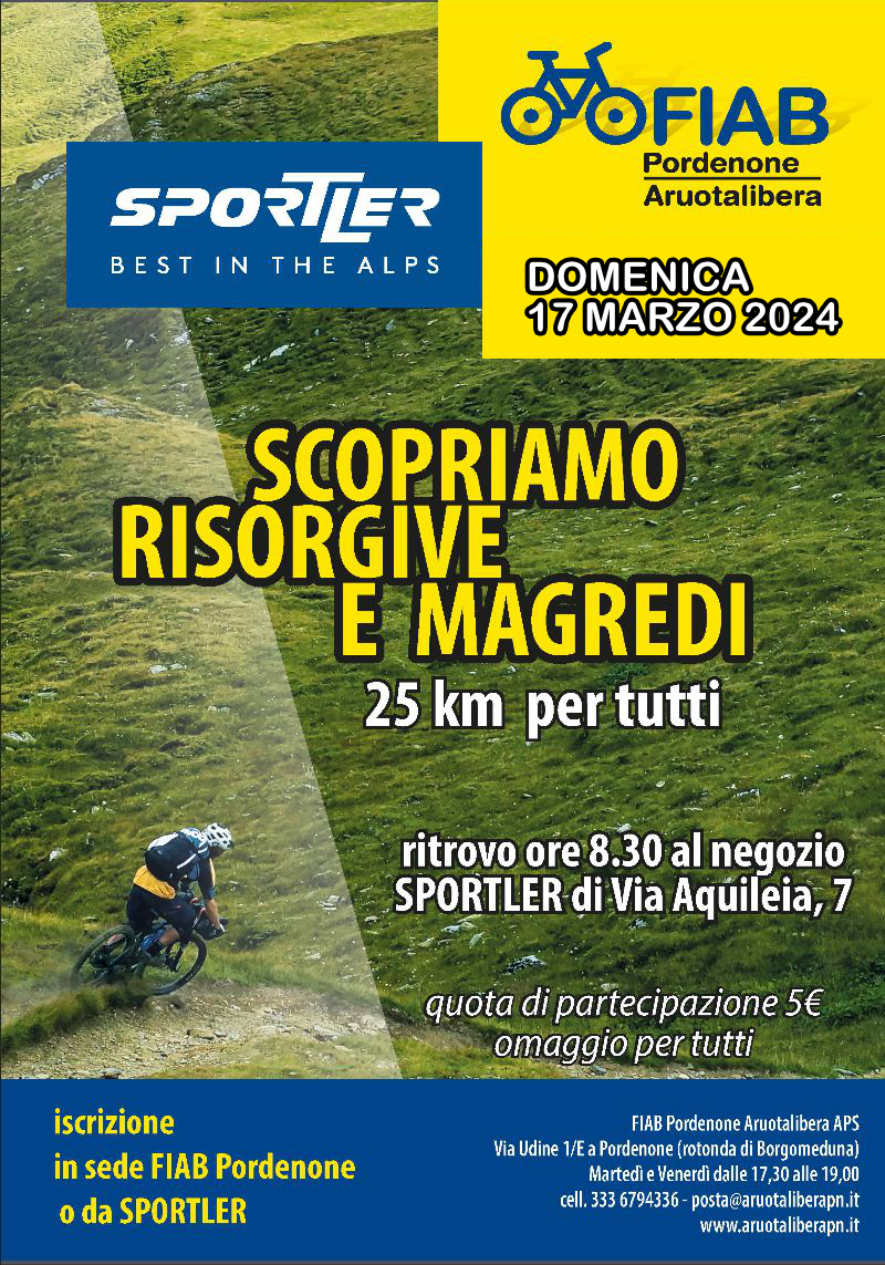 Per iniziare la stagione con il pedale giusto l'appuntamento sarà al negozio Sportler di via Aquileia a Pordenone. Dopo una breve presentazione del programma del 2024 potremo partire in bicicletta per un facile giro esplorativo naturalistico alla portata di tutti, grandi e piccini, l'occasione giusta per conoscere FIAB e trovare la sorpresa che Sportler ha riservato per i partecipanti.